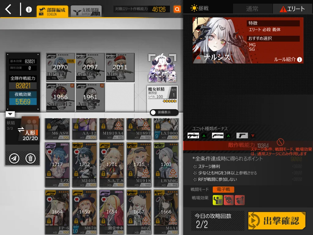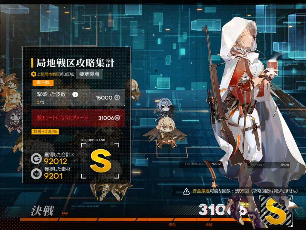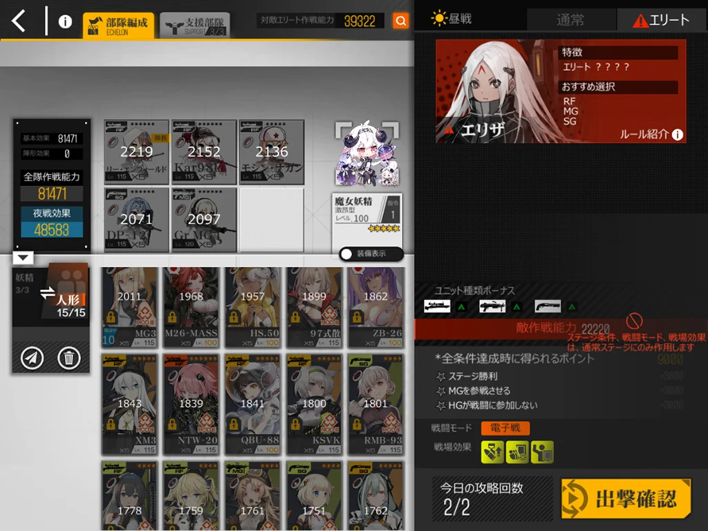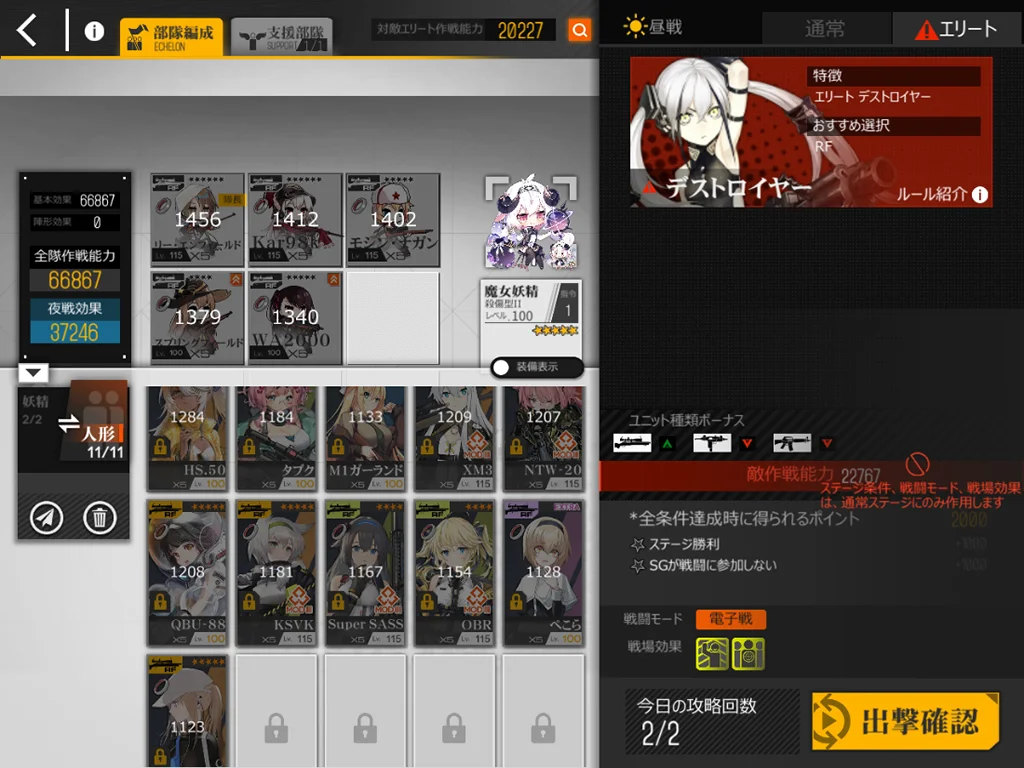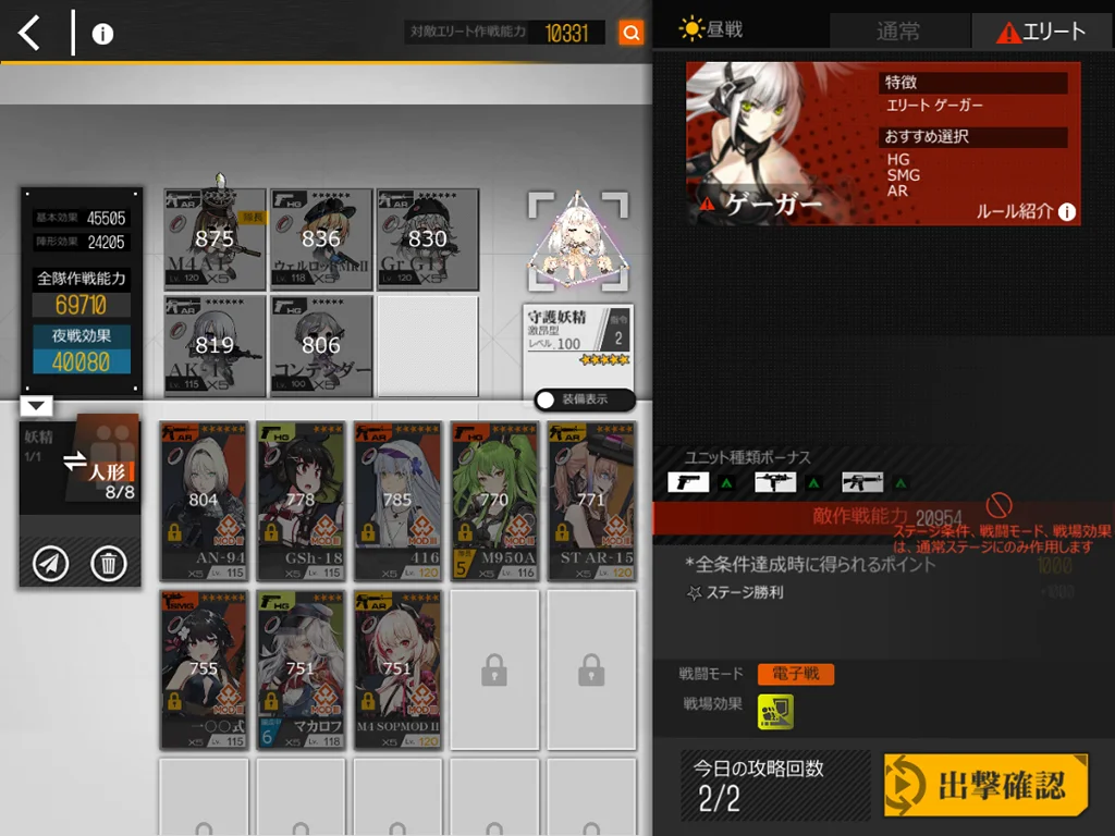 狙撃妖精が強い。貫通レーザーがどこをターゲットしているか不明なのでゴリ押しました。スオミを9に配置、他4ARは1245に配置。XM8とAK15、M4、G11を使うと、貫通レーザー一回分ぐらいで倒せました。XM8が目眩にしてくれるのはありがたい。AK15が防御適正が高いのも良い。正直ターゲット演習に追加できるようにしてほしい。